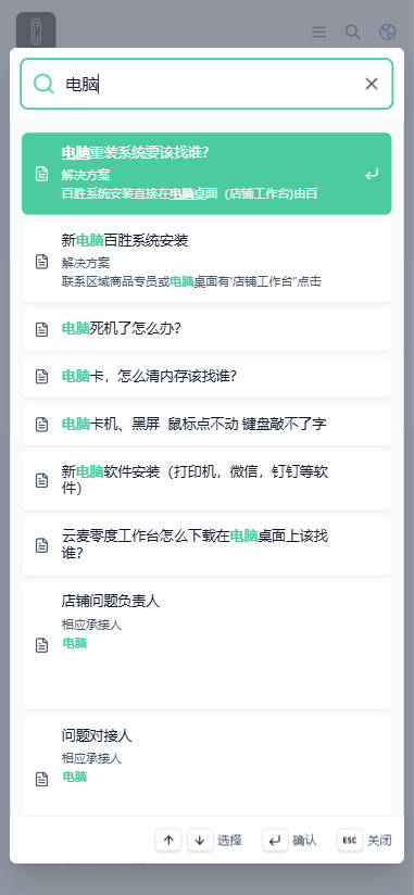 如您遇到了问题 需要找解决方案 或相关联系人 请点击 右上角的“搜索”图标举个例子 比如 店里电脑出现了故障 我们不知道找谁 我们就输入关键词"电脑"然后将您的实际问题输入在搜索框内 就可以搜索出相关的解决方案以及负责人